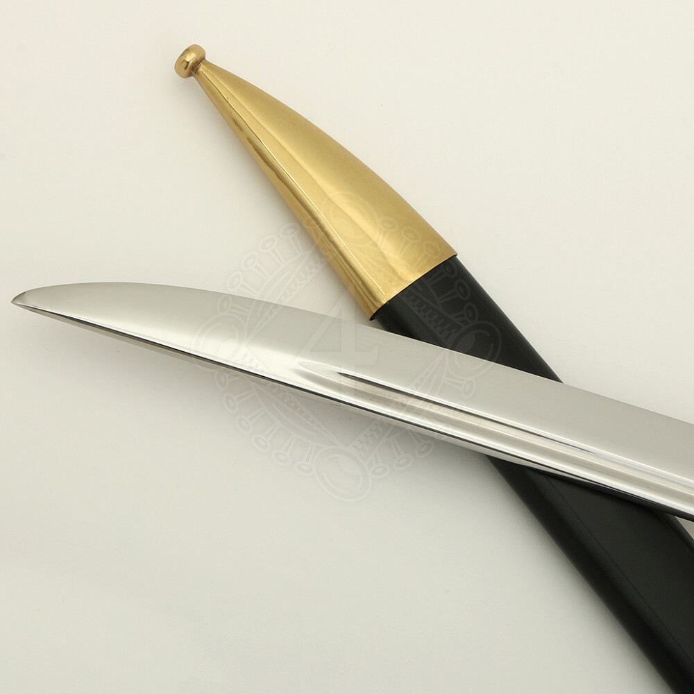- Scheide: Im Lieferumfang enthalten ist eine elegante schwarze Scheide (Lederimitat), die mit Beschlägen in Messingfarbe (Mundblech und Ortblech) versehen ist, was perfekt zum Griff der Waffe passt.